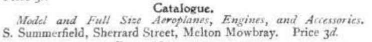 “Catalogue: Model and Full size aeroplanes, Engines and Accessories. S Summerfield, Sherrard Street, Melton Mowbray. Price 3d.”